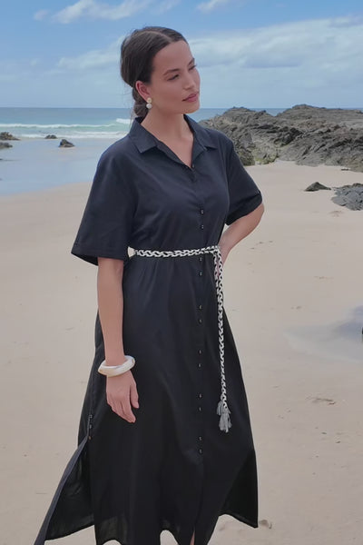 The Amani Collared Dress is a modern wardrobe essential. Made from 100% cotton, it’s designed with a soft collared neckline, double cuffs, and side button detailing that opens to a gentle split. In classic black, it’s a new Adrift favourite that balances ease with sophistication.