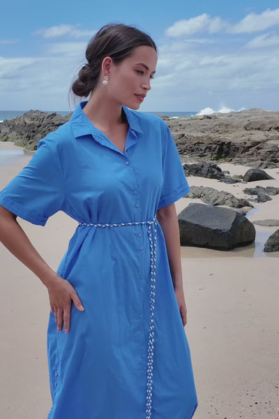 The Amani Collared Dress in Regatta introduces a pop of coastal blue to your summer wardrobe. Designed in 100% cotton, it features a relaxed collared shape with double cuff sleeves and side button detailing. The rich Regatta hue brings a refreshing burst of colour to this effortlessly versatile new Adrift style.