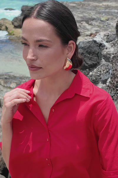 The Amani Top in Racing Red brings bold colour to an easy, timeless shape. Crafted from 100% cotton, it features a smart collared neckline, double cuff short sleeves, and a soft curved hemline. A statement in both style and simplicity, it’s a vibrant addition to your summer wardrobe.