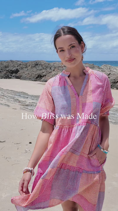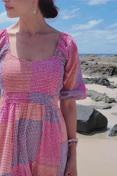The Anika Dress is a true artisanal piece, crafted from 100% cotton and hand-printed in a vibrant gingham patchwork design. With its square neckline, billowing sleeves, and flowing tiered skirt, this dress captures an effortlessly feminine charm. Each print is uniquely placed, celebrating the beauty of handmade detail.