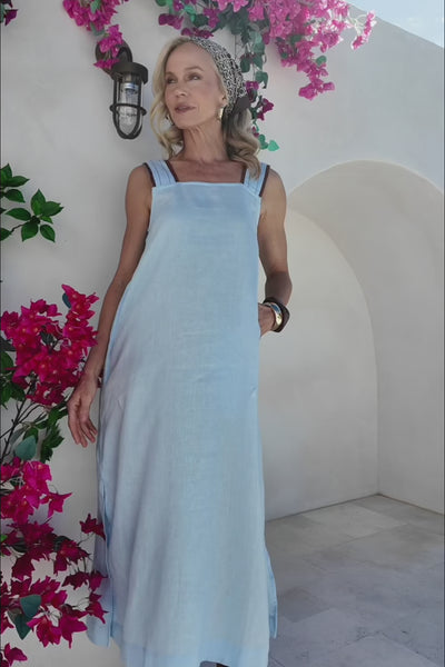 Effortlessly cool and flattering, the Bec Linen Sun Dress in Powder Blue combines an A-line silhouette with wide straps, side splits, and thoughtful contrast details. Made from 100% linen, it’s perfect for breezy, everyday luxury.