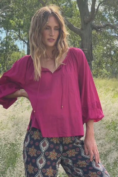 The Breezy Relaxed Pant features a loose, easy silhouette that has become a much loved everyday shape, now elevated in the striking Veloura print. Crafted from breathable rayon, they move comfortably with the body and are designed to pair beautifully with the Delilah Swing Blouse in Magenta.