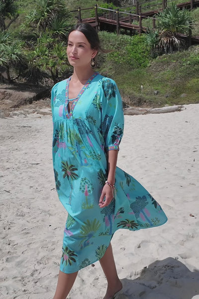 Channel relaxed boho elegance with the Cairo Boho Dress in Blue Oasis, complete with ¾ elasticated sleeves, and a flowing gathered skirt. Crafted from premium 100% cotton voile, it’s soft, breathable, and designed for easy summer style.