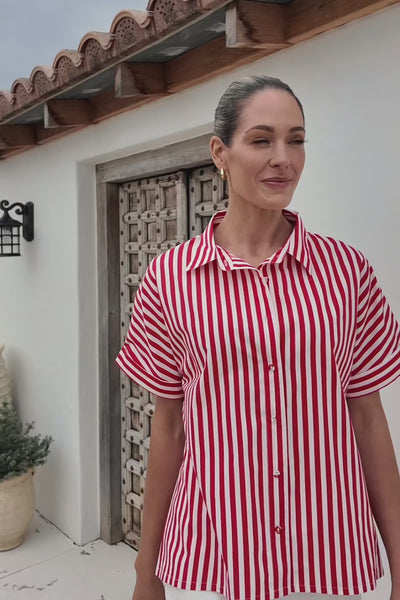 The Carmen Shirt in Red Stripe is fresh, classic and easy to style, finished with a relaxed cut and button through front. Crafted from 100% cotton for breathable everyday comfort.