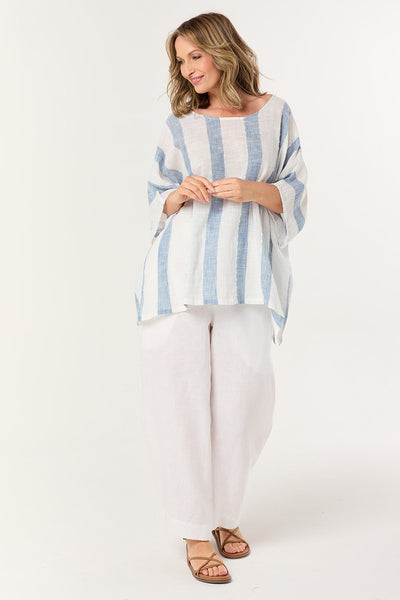 The Australian-designed Cherry Oversized Top in Blue Stripe is perfect for summer getaways, crafted from soft, breathable cotton in a timeless stripe. With a flattering boat neckline and batwing sleeves, it’s a versatile holiday blouse for coastal and city dressing alike.
