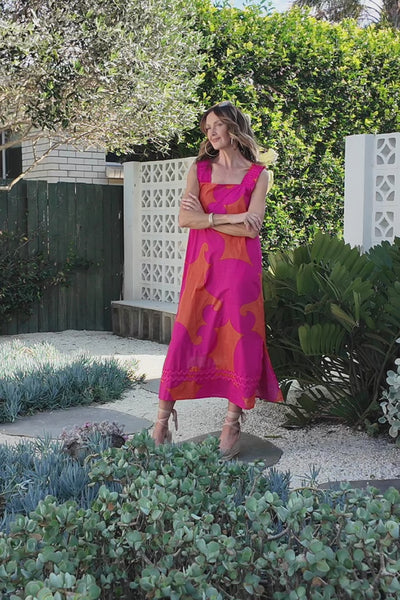 Make a statement in our bold Claire Sun Dress in Flame, detailed with frilled straps, side hem splits, and playful ric rac trim. Designed in Brisbane from lightweight, naturally soft cotton, it’s perfect for sunny days and carefree city strolls.