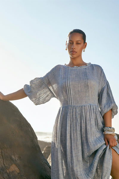 The Coco is the ultimate in laid-back luxury. Crafted from premium 100% linen, it features a soft billow silhouette, elastic waist, and graceful neckline for a feminine, elevated finish. Its breezy texture and tranquil blue hue make it a timeless staple for effortless summer dressing.