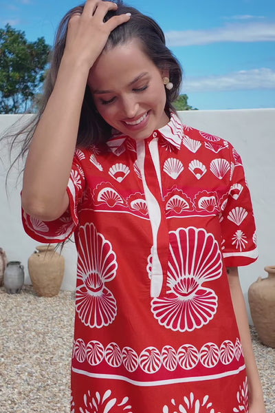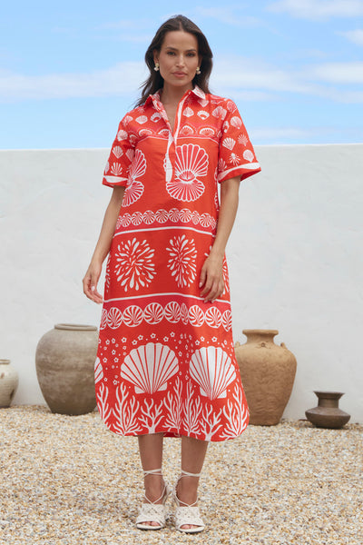 The Ella Midi Dress captures the carefree energy of summer in bold coral and white tones. Crafted from crisp cotton poplin, it features a relaxed silhouette with short sleeves, a notched neckline, and side splits for ease of movement. A refreshing mix of comfort and coastal charm, perfect for bright days and balmy evenings.