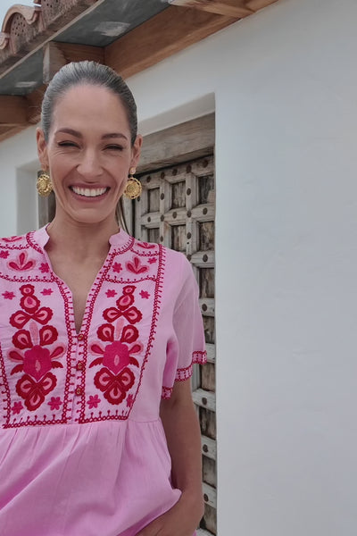 Elodie shines in Rosita, embroidered in rich vermillion that feels vibrant, feminine and full of warmth. Lightweight and 100% cotton, it’s an easy-wear piece with beautiful detailing that elevates everyday dressing.