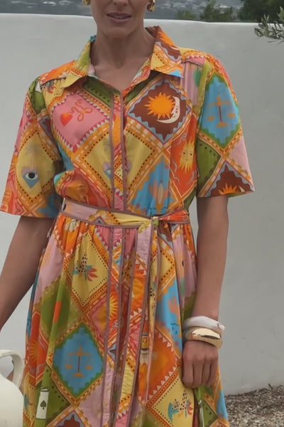 Ginette lights up the room in the vibrant Sunset Club print, full of bold florals and fun colour play, crafted from 100% cotton with a relaxed collared shape and an adjustable waist tie for shape or ease.