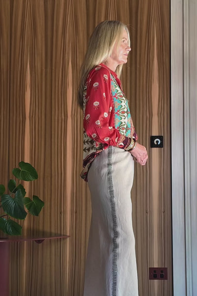 The Katie Bias Cut Skirt falls softly through a clean, fluid silhouette, finished in a natural base with delicate green zig zag embroidery running down the sides for subtle detail. Crafted from 100% linen, it feels breathable and beautifully fluid on the body, making it an easy choice for everyday wear with a refined touch.Slim-line long bias cut skirt