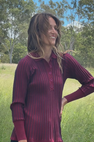 The Knitted Collared Jumper features the same polished silhouette with a soft collar, now finished in bold cherry red and navy stripes for a confident, eye catching look. Crafted from a comfortable stretch knit, it feels soft and flexible on the body and pairs effortlessly with denim or the matching Cherry Red A Line Skirt.