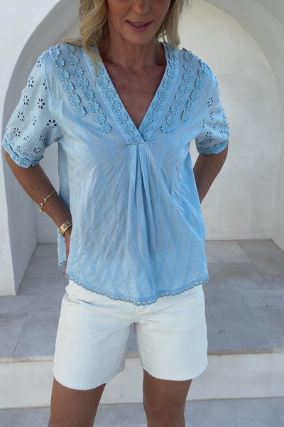 Soft and airy, the Kora Daisy Embroidered Blouse in Pale Blue was designed with a V-neckline and curved high-low hemline. Made from beautiful 100% cotton broderie, it brings effortless feminine elegance and breathable comfort to your wardrobe.