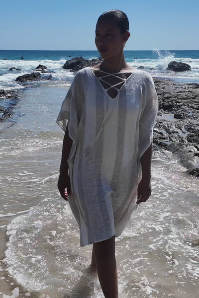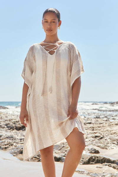 The Liesl Short Kaftan in Natural Stripe is designed for easy holiday dressing, with a reversible neckline and relaxed fit. In a white and natural stripe, it’s the ultimate summer kaftan for beach getaways and luxe resort style.