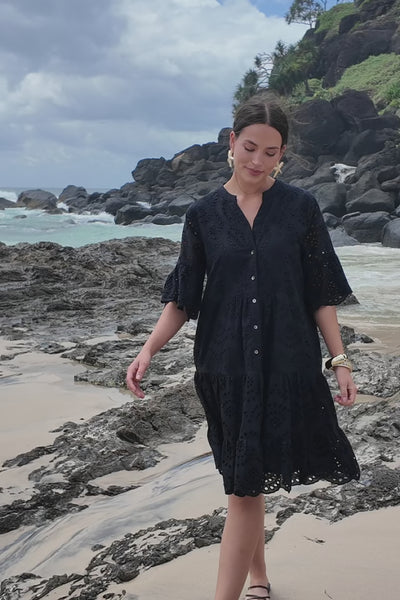 The Lynette Shift Dress in Black Broderie Anglaise offers timeless sophistication with a modern edge. Crafted from intricate cotton embroidery, it features a relaxed tiered silhouette, soft bell sleeves, and a half-button front. Perfect for day or evening, this dress captures easy elegance with a touch of texture and depth.