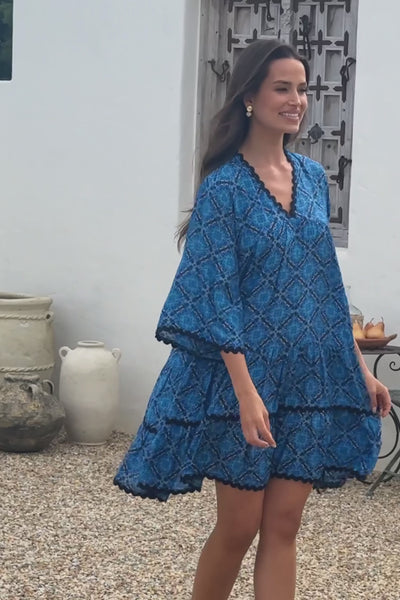 The Mable Dress brings a touch of relaxed luxury to summer dressing. Crafted from a beautiful cotton silk blend, it’s lightweight, breathable, and softly lustrous against the skin. The short silhouette features elegant trims, a gentle V-neckline, and wide sleeves that create beautiful movement. In striking shades of blue, this piece feels refined yet easy - perfect for warm days and balmy evenings.