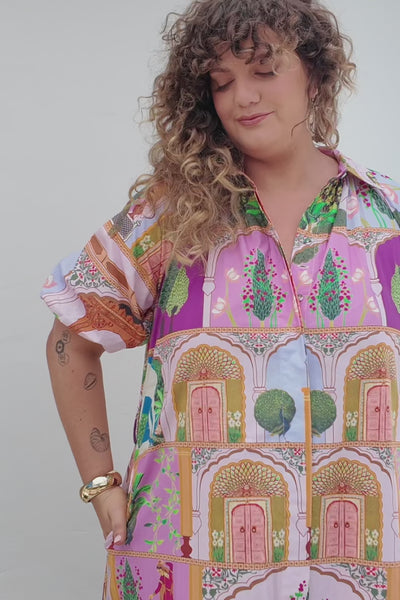 The Matilda Collared Dress in Padam Mosaic is a celebration of colour and creativity. Crafted from 100% cotton, it features a classic collared neckline, button-through front, and a waist tie that shapes the silhouette with ease. The vibrant mix of pinks, greens, and golden tones brings the print to life, creating a striking statement for summer days.