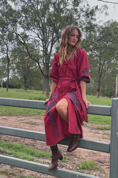 Rich and expressive, the Robin Belted Dress in Inkwell Burgundy showcases intricate embroidery against a deep, moody base. Designed with a flattering belted waist and flowing midi length, it’s an easy hero piece with presence.
