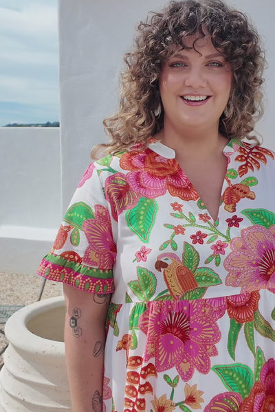A beloved Adrift classic, the Sabre Frill Dress is a best-seller for a reason. Its tiered silhouette, soft frill detailing, and relaxed fit create an effortless shape made for easy, everyday wear. With a wide round neckline, practical pockets, and bright pink and green florals, it’s the perfect balance of comfort, style, and timeless appeal.