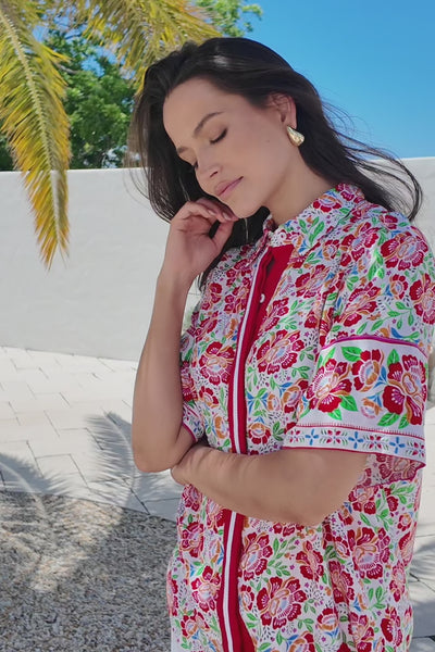 The Sam Short Sleeve Shirt in Verdelle brings a fresh, floral twist to a relaxed classic. Featuring a crisp collar, soft short sleeves, and a curved hemline, this easy-to-wear style pairs beautifully with linen pants or denim. The vibrant red and green floral print adds a cheerful pop to any summer wardrobe.