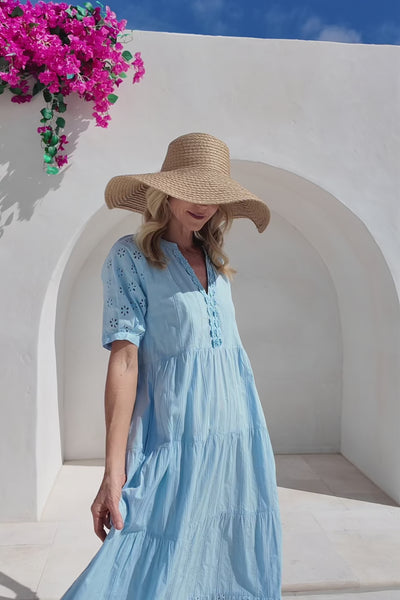 The Savannah Daisy Embroidered Dress in Pale Blue, crafted in soft 100% cotton broderie boasts a charming round neckline with a subtle V-opening, pleated short sleeves, and convenient pockets. It’s the perfect blend of feminine detail and breezy comfort for warm days.