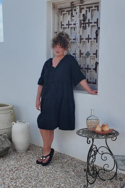 The Scout Dress in Black redefines easy elegance. Made from 100% rayon, it offers a breezy, breathable feel that makes it a must-have for your summer wardrobe. The relaxed silhouette, soft flutter sleeves, and tiered skirt create effortless movement and style. Perfect for any occasion, it’s your go-to little black dress with a modern, carefree twist.