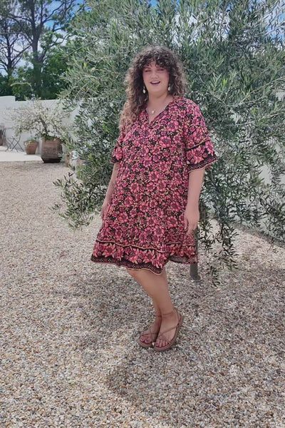 - 100% Rayon - Rayon is a luxurious, semi-natural fabric crafted from plant sources like wood pulp. Its silky, fluid drape makes it perfect for our elegant tiered dresses, while its crush-resistant nature ensures effortless wear and travel-ready ease. With exceptional dye absorption, it brings our vibrant prints to life.