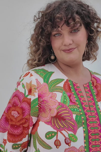 An Adrift summer favourite, the Scout Dress captures effortless charm with its tiered silhouette and softly gathered frill cuffs. Crafted from lightweight cotton in a cream base with pink and green florals, it features a notched neckline with fabric ties and practical pockets for ease. Designed in Brisbane, it’s a fresh and feminine piece made for sunny days and easy moments.