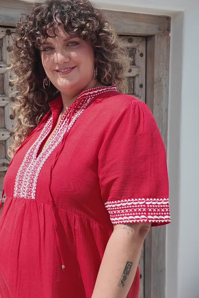 The Tanya Embroidered Dress is the definition of festive summer style. Made from a beautiful linen-cotton blend, it features delicate white embroidery against a rich red base, capturing the joy of the season. With its relaxed fit and breathable fabric, it’s perfect for Christmas Day — stylish, comfortable, and ready for every toast and second helping.