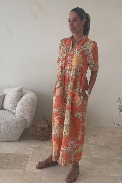 The Tanya Short Sleeve Dress is brought to life in warm, sun washed tones of coral, soft peach and olive, layered through our exclusive Palampore print. Featuring a relaxed silhouette with short sleeves, a flattering V neckline and an easy flowing skirt, it’s a beautiful throw on style that feels effortless yet considered.