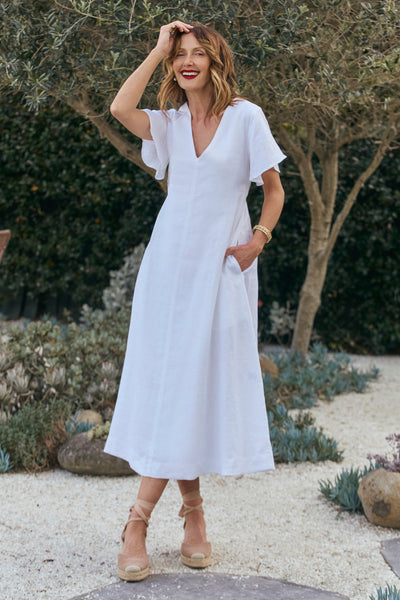 Crafted from beautiful soft linen, the Tatum Linen Flutter Sleeve Dress in White features flutter sleeves, a V-neckline, and versatile fabric ties to cinch at the waist. Designed in Brisbane, it’s a timeless piece blending effortless femininity with natural fibre luxury.