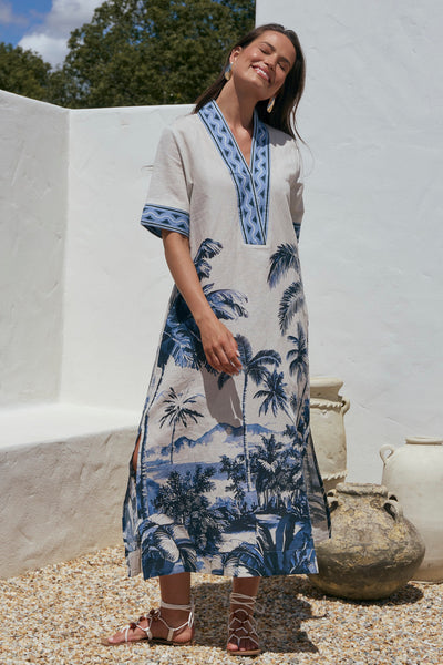 The Tia Tunic Dress in Bahama Breeze captures easy island elegance in a beautiful linen blend. Featuring a striking coastal palm print in rich navy tones, it’s designed with a relaxed shape and intricate neckline detail for a touch of refinement. Perfect for sunny days or coastal getaways, this dress blends laid-back charm with timeless Adrift style.