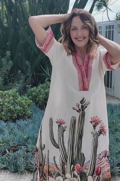 The Tia Tunic is a standout piece that captures the spirit of summer with ease and confidence. Featuring a kimono-style collar, deep V-neckline, and side splits, its relaxed silhouette offers both comfort and style. The striking cactus border print brings an artistic edge to the soft linen cotton fabric, creating a look that feels fresh, bold, and beautifully timeless.